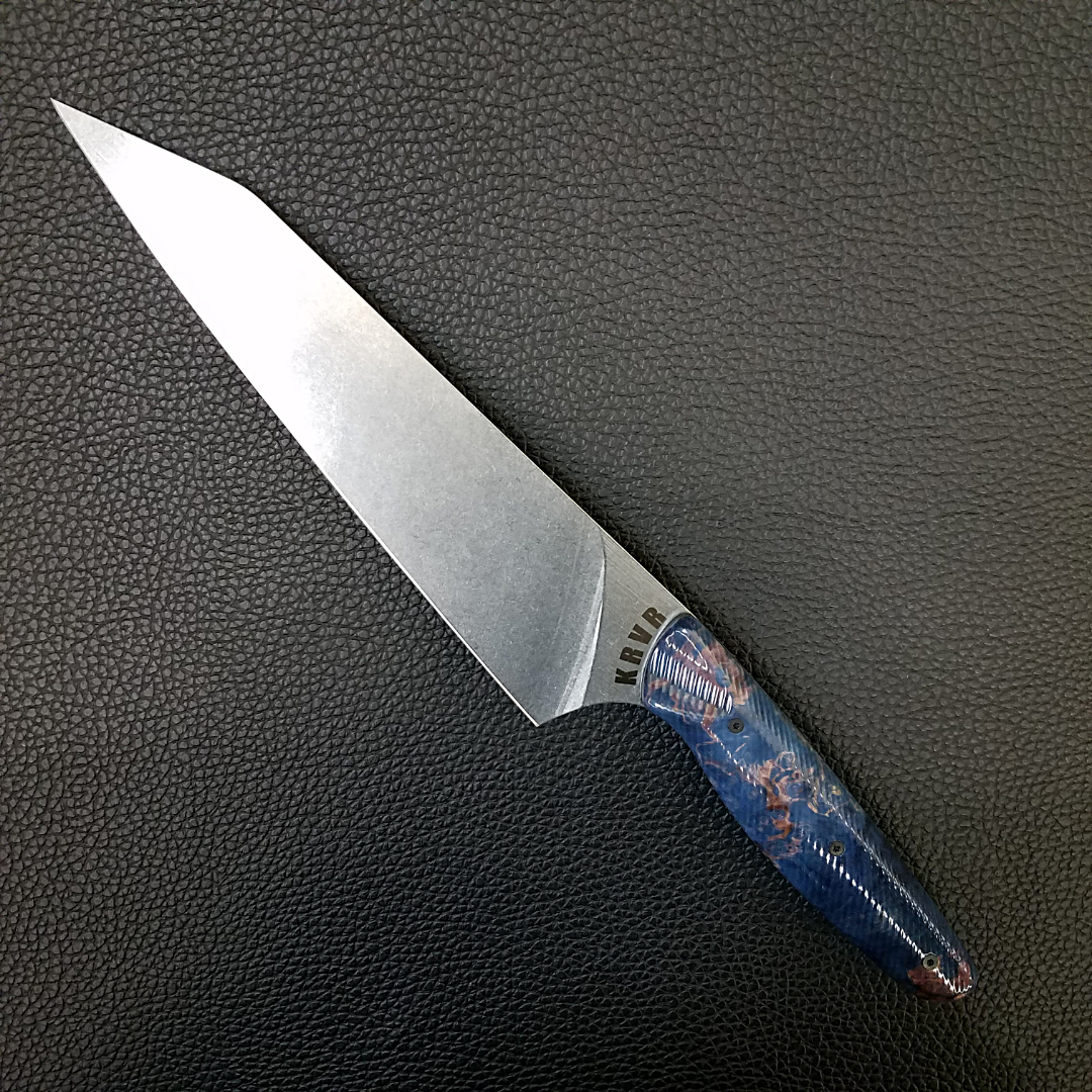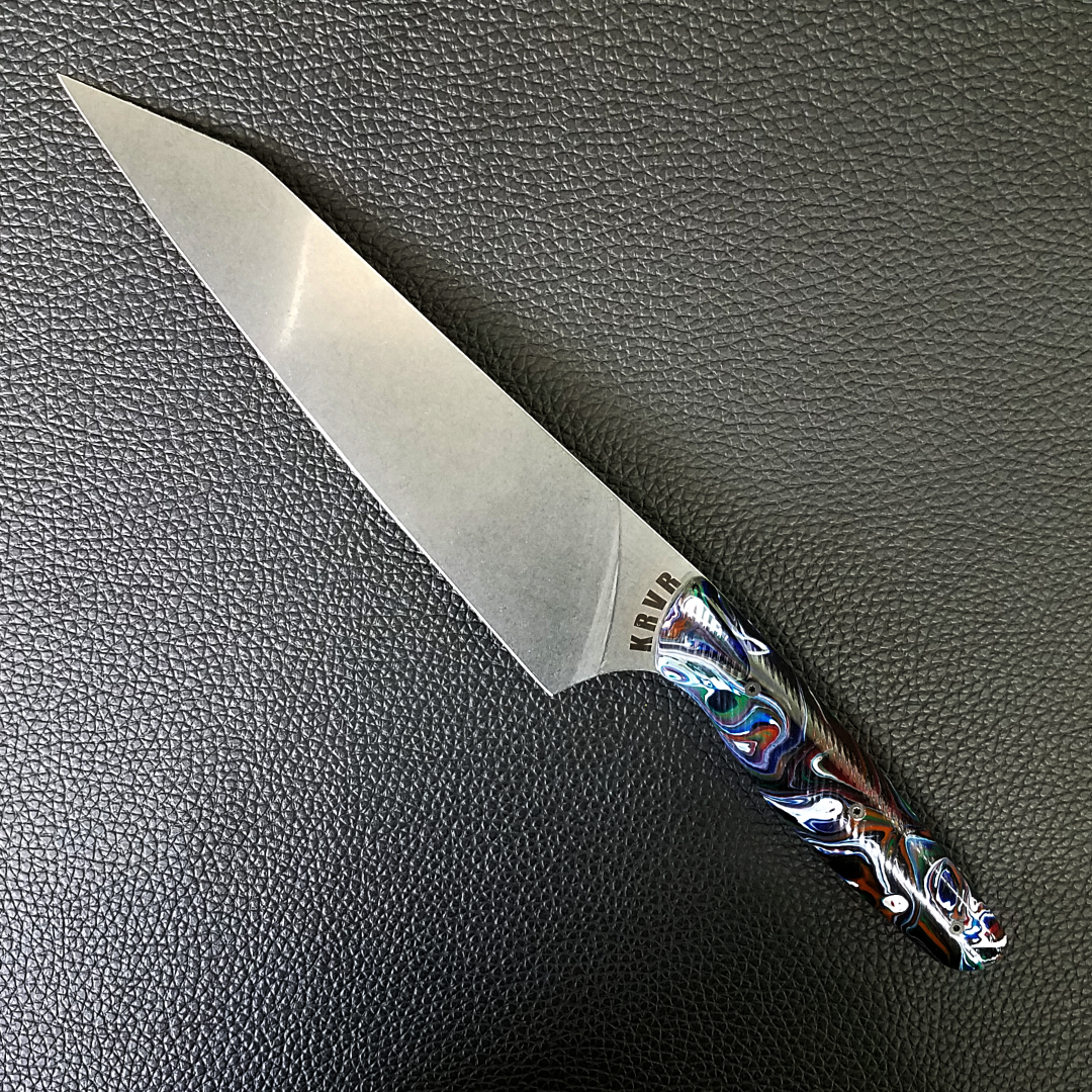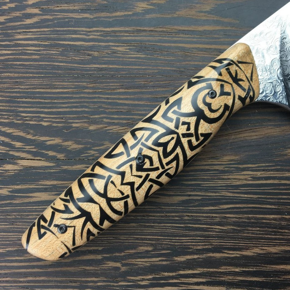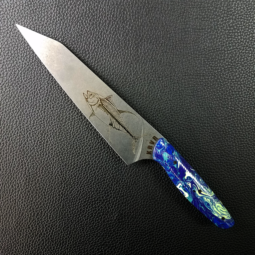 KRVR Chef Knives with unique patterns etched on the blade or inlaid in the handle.