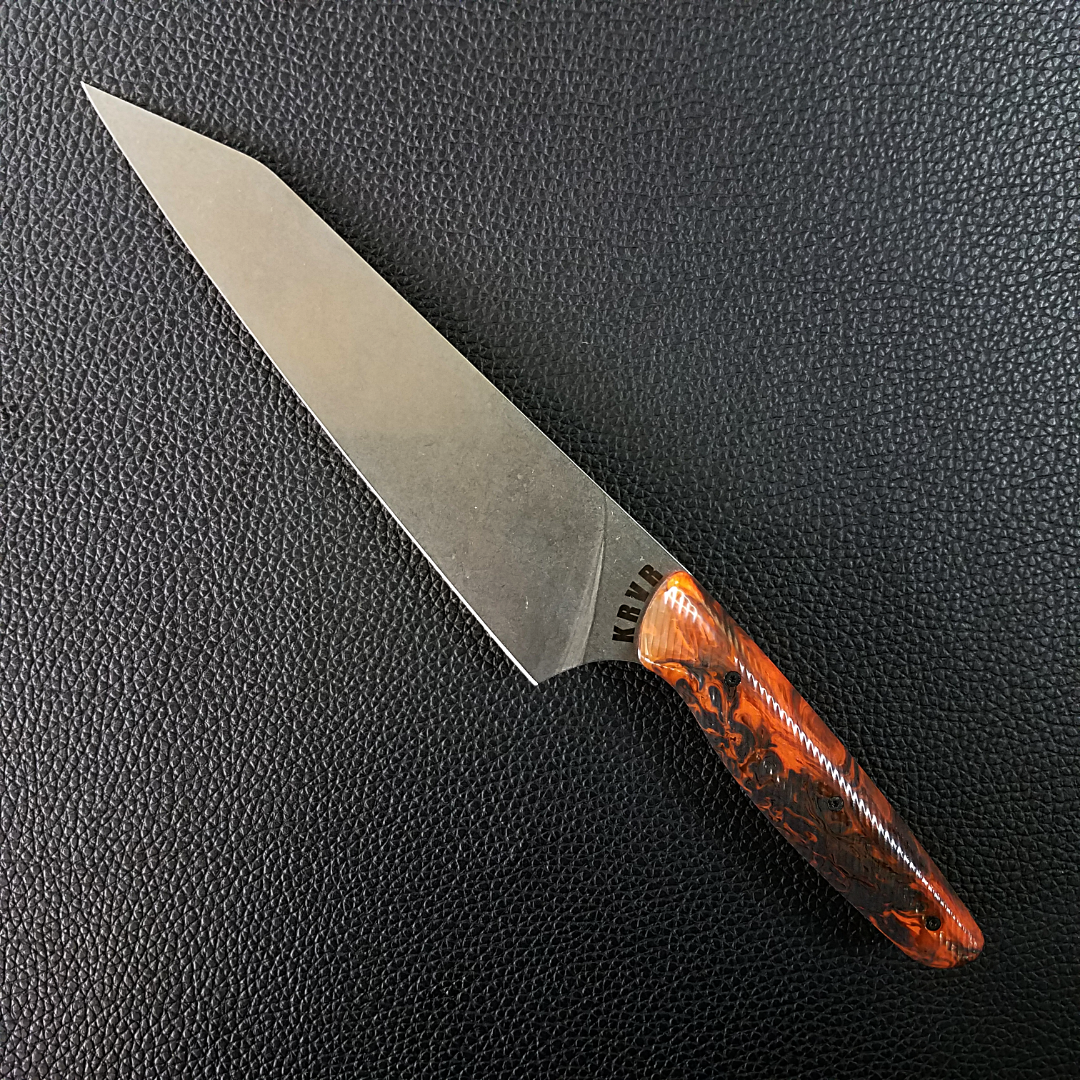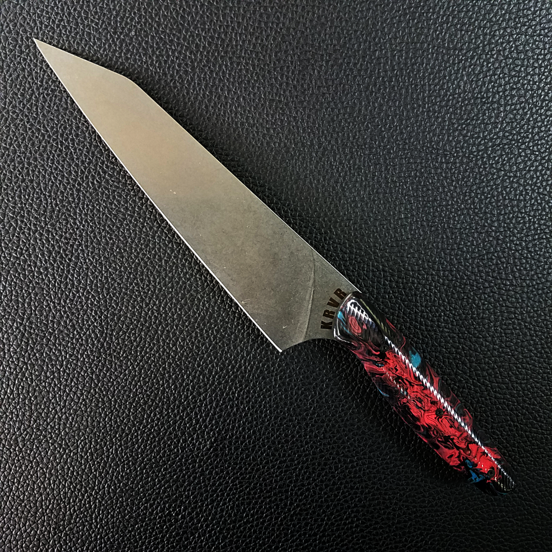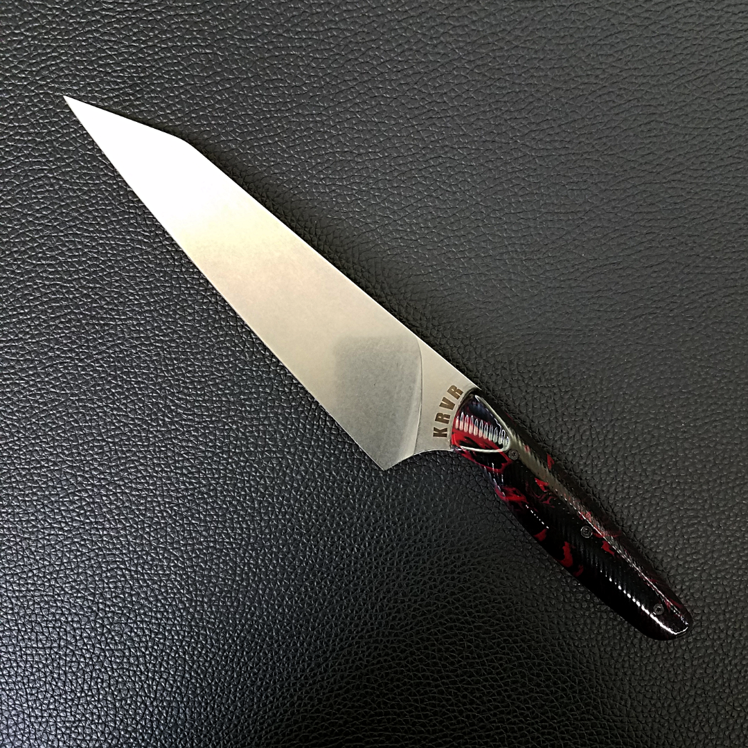 KRVR Chef Knives with unique patterns etched on the blade or inlaid in the handle.