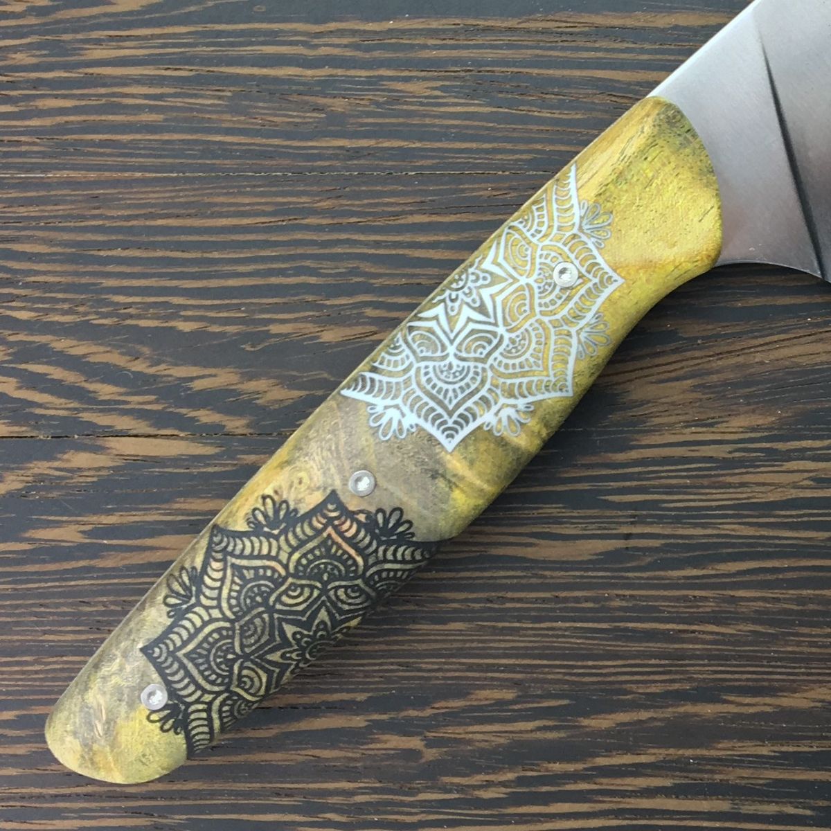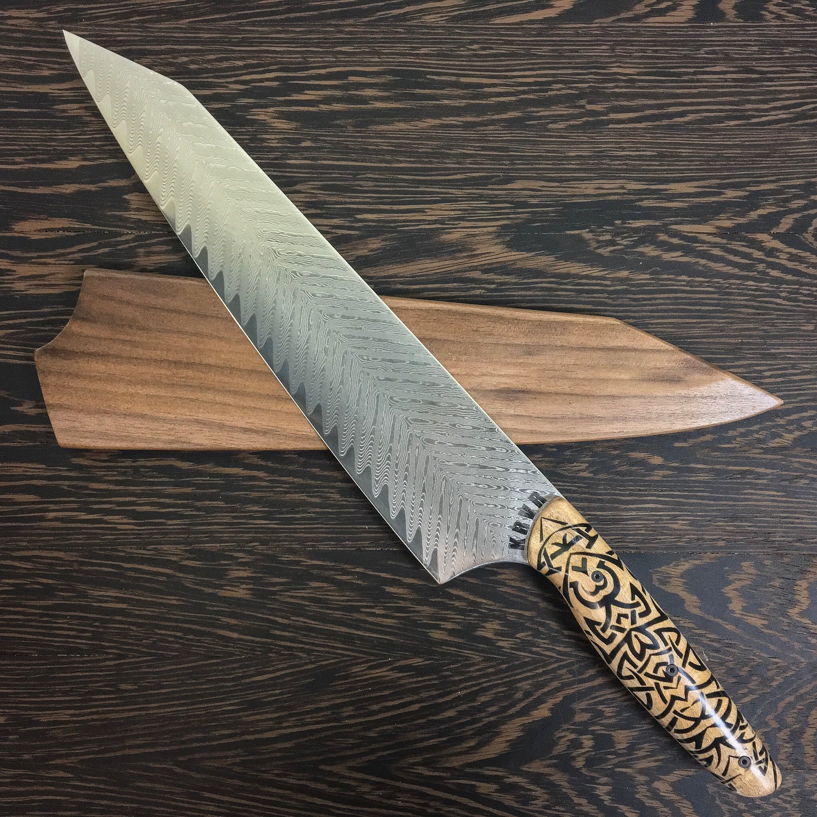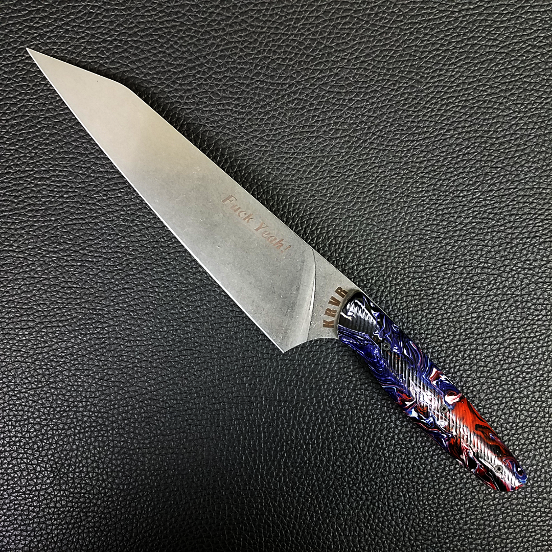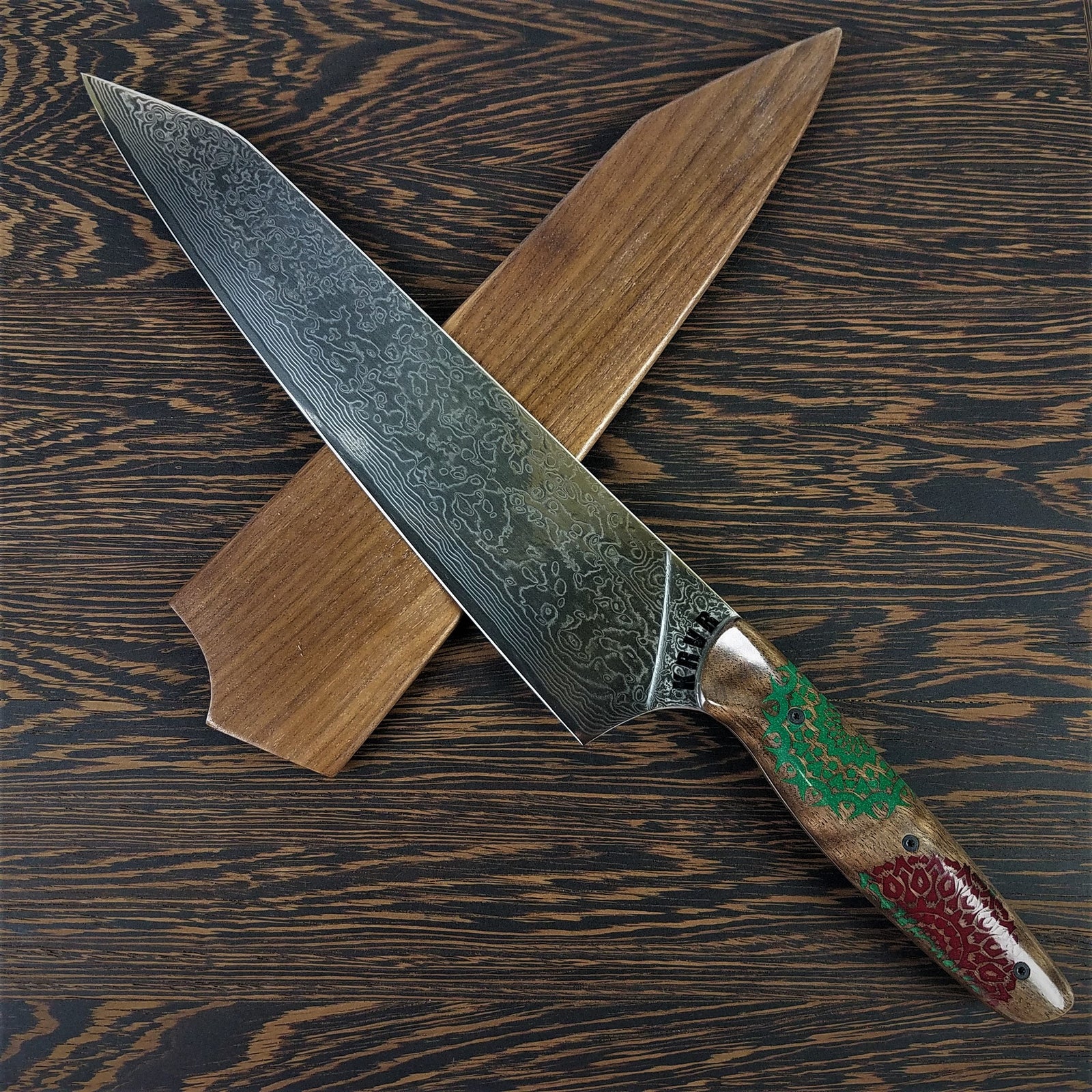 KRVR Chef Knives with unique patterns etched on the blade or inlaid in the handle.